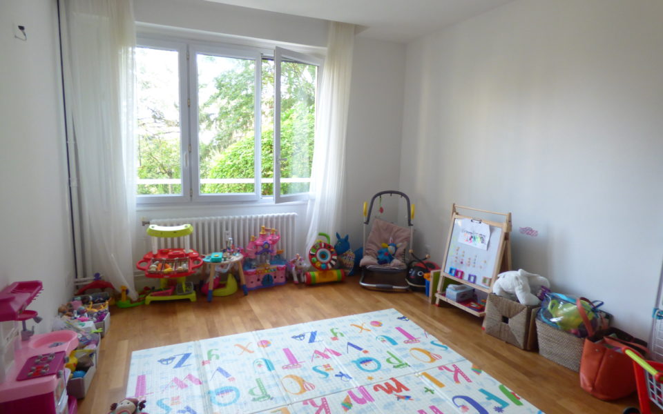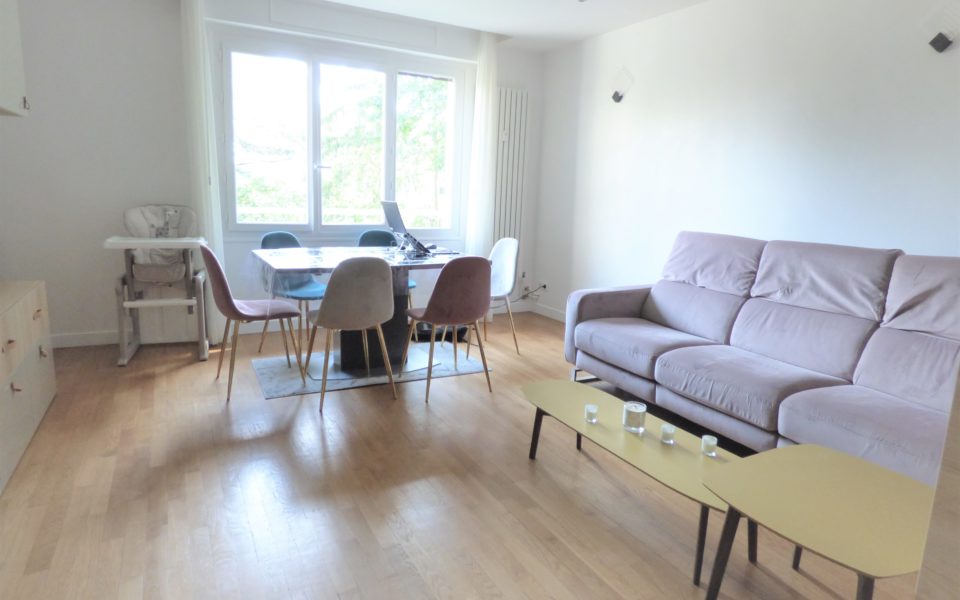 Avec pleine vue sur le parc arboré de la résidence, un appartement rénové par un architecte en 2019, très clair et ensoleillé avec une décoration et des prestations soignées, en rez-de-jardin surélevé, composé d’une entrée qui ouvre sur le séjour avec vue sur le jardin et sur Paris, une cuisine moderne équipée, une chambre parentale avec salle de douches, une deuxième grande chambre et une autre plus petite ou bureau, une salle de bains avec wc et un wc indépendant.