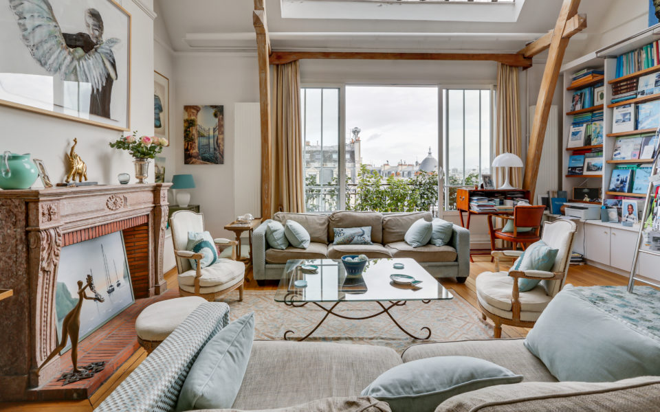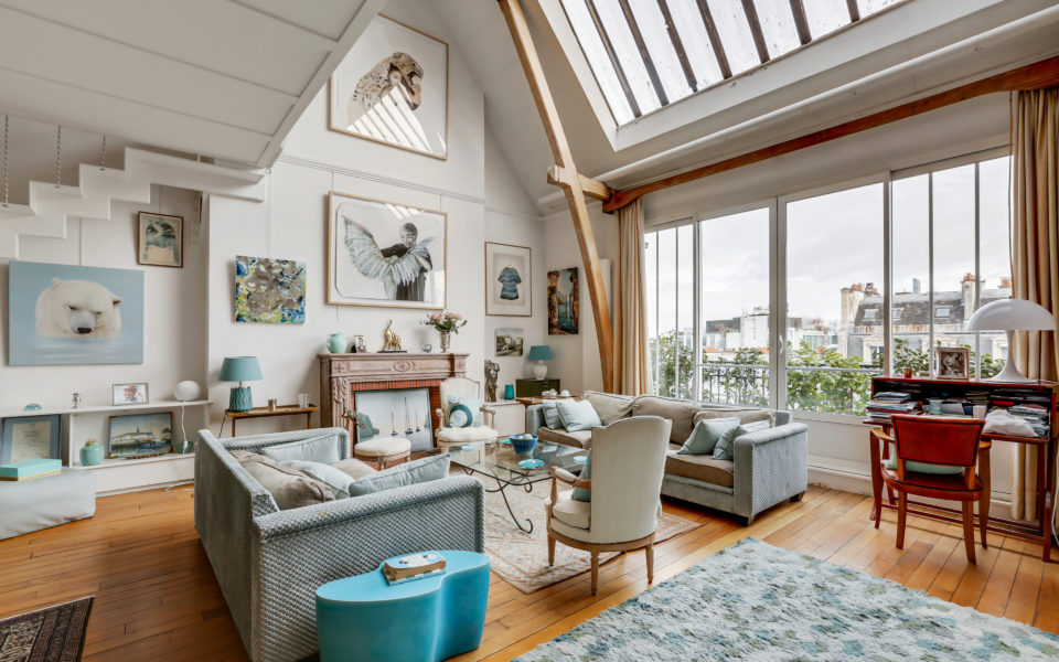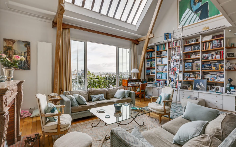 Dans un bel immeuble haussmannien des années 1900, au 6ème étage par l’ascenseur, un atelier d’artiste/loft lumineux rénové et calme avec une vue spectaculaire sur Paris, la Tour Eiffel et Montmartre, d’une surface totale de 116,97m² dont 87,27m² carrez composé: d’une entrée, d’un dégagement, d’un séjour cathédrale/ salle à manger traversant avec des baies vitrées ouvrant sur un balcon filant (de 4,25m²), d’une cuisine équipée, d’une chambre principale, d’une autre chambre ou bureau et une salle de bains avec WC. Du séjour, par un escalier, accès à une chambre en mezzanine de 20m²avec salle de douches et WC.